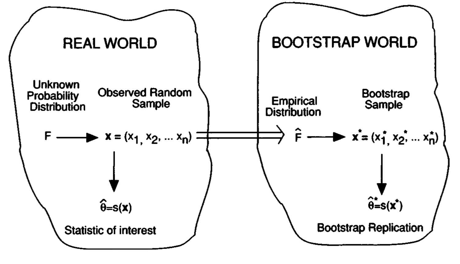 the proportion of the observed sample \(\mathbf{x}=\left(x_1, x_2, \cdots, x_n\right)\) occurring in \(A\). We will also write \(\operatorname{Prob}_{\hat{F}}\{A\}\) to indicate \(\widehat{\operatorname{Prob}}\{A\}\). The hat symbol ” \(\wedge\) ” always indicates quantities calculated from the observed data.